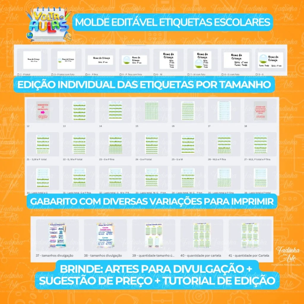 • Template de Edição das Etiquetas por tamanhos:  P (Fina e Total), M, G e Lápis total