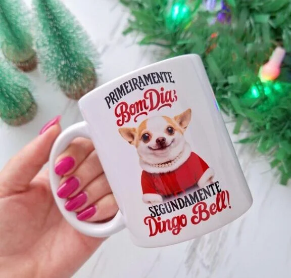 Primeiramente BOM DIA, segundamente DINGO BELL – Arte Avulsa Caneca